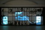 Videoprojection on paper cutout grid, b/w photocopies, 200 x 500 cm - VIDEO AVAILABLE IN THE VIDEOS SECTION