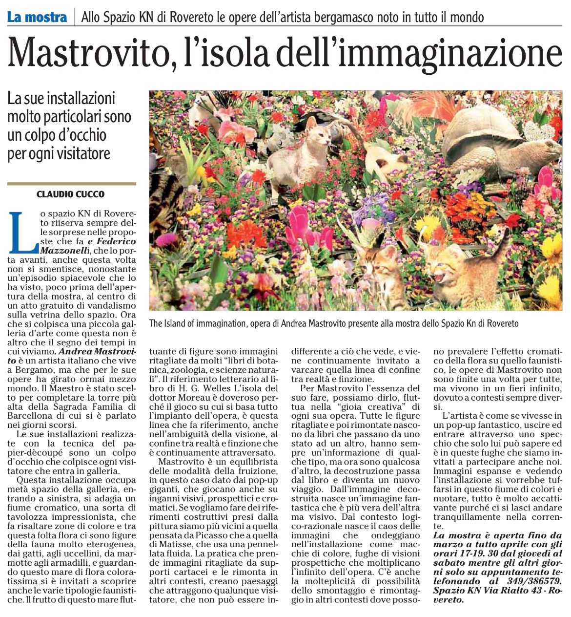 The exhibition revolves around The Island of Dr. Mastrovito's, presented in a smaller form and adapted to the small spaces of Spazio Kn, a nonprofit organization based in Rovereto (Trento) and managed by curator and art historian Federico Mazzonelli. The exhibition is accompanied by an artist's multiple, in a limited edition of 200 copies, which also serves as a small exhibition catalogue with a text by Gabriele Lorenzoni.